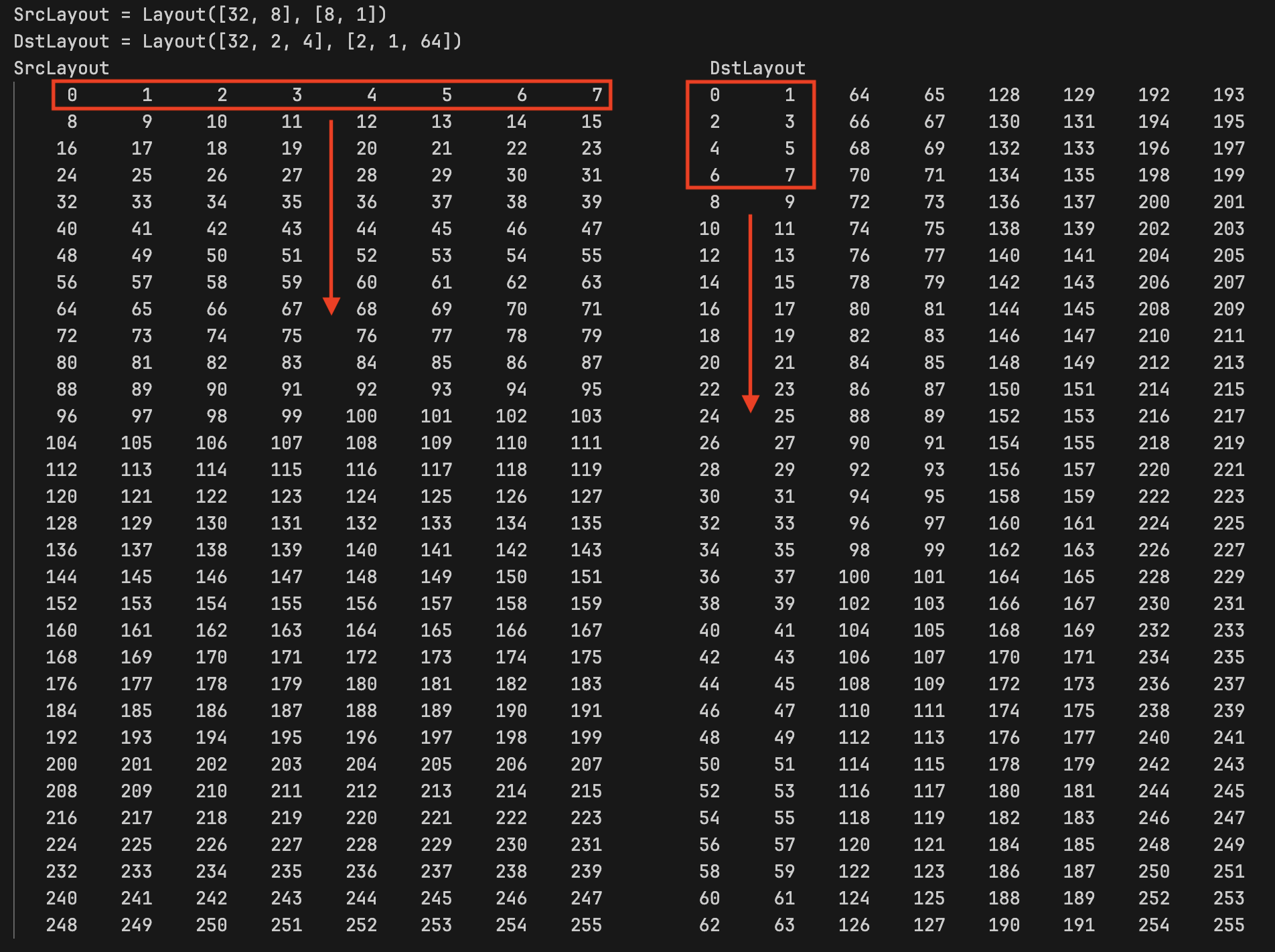上面的打印中相同的数字代表了相同的 logical mem id,即他们代表了统一个元素。可以看到在 src 当中的 t0 拥有数据 0~7,他们分别分配到了 dst 当中的 t0~t3 中的前两个 values 当中。而对于 dst 当中的 t0 数据则来自于 t0, t8, t16, t24 的前两个 values