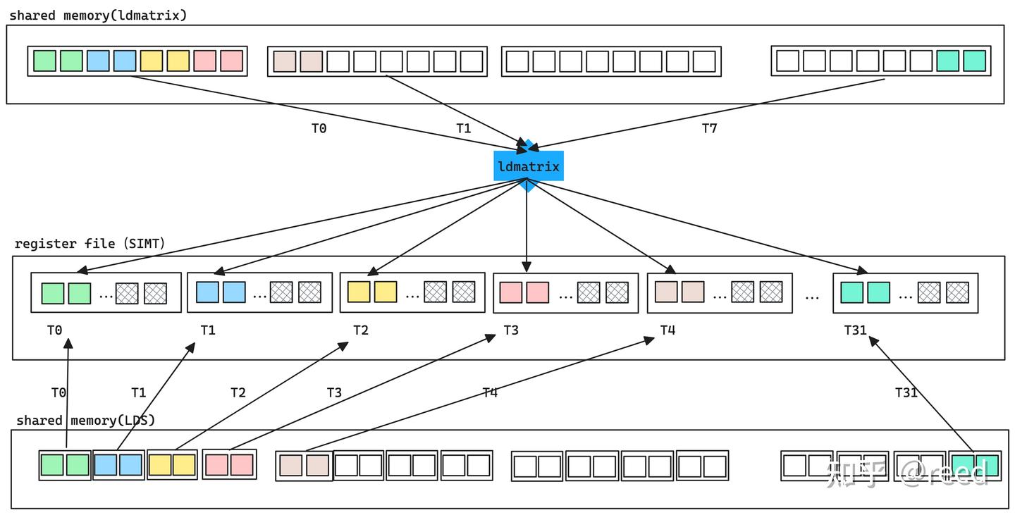 ldmatrix 是为了满足 mma atom 的特殊排布应运而生,ldmatrix 能够将自己线程的数据发送到其他线程当中,这在常规的 CUDA 编程中是做不到的,因为在 SIMT 编程下我们认为寄存器是线程私有的。