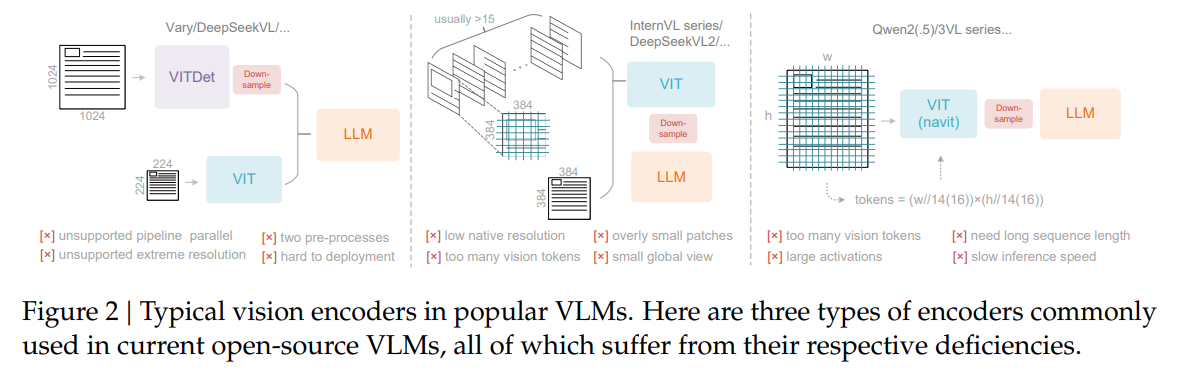 其实 VLM 常见的结构就是 ViT + LLM,即使是 DeepSeek-OCR 也是一样的配置。这里只提下之前工作的缺点