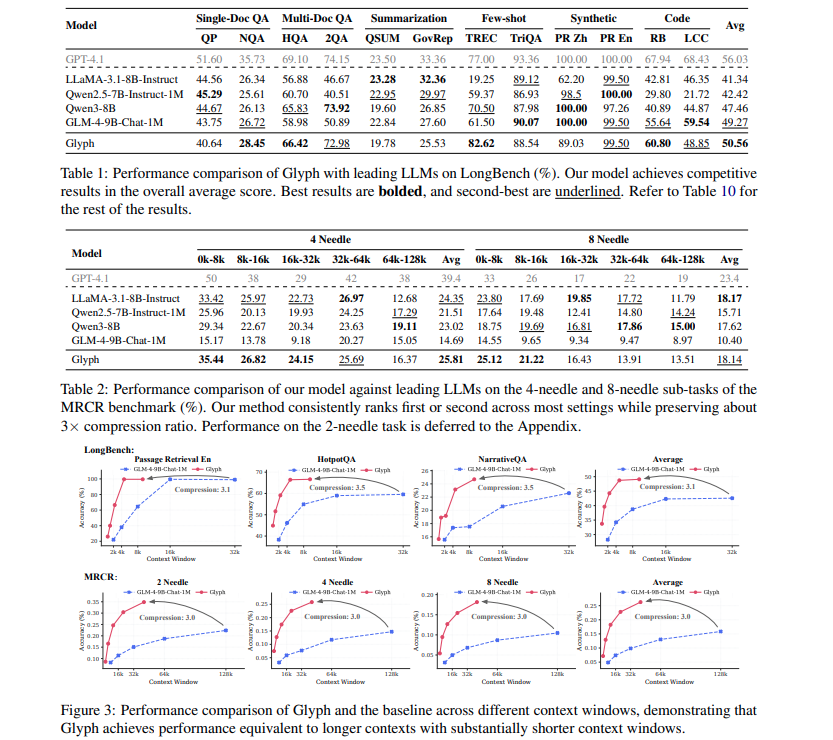 - Glyph 不是用 OCR 领域出发来阐述算法效果,而是真正使用了 LLM 领域中的 LongBench (类似长上下文中的大海捞针任务)来说明 vision token 对文本的压缩率很高