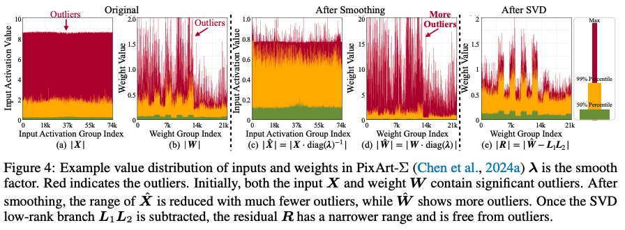 SVDQuant 首先也采用 AWQ/SmoothQuant 当中的 smoothing 方法,把 activation 当中的 outlier 转移到 weight 当中