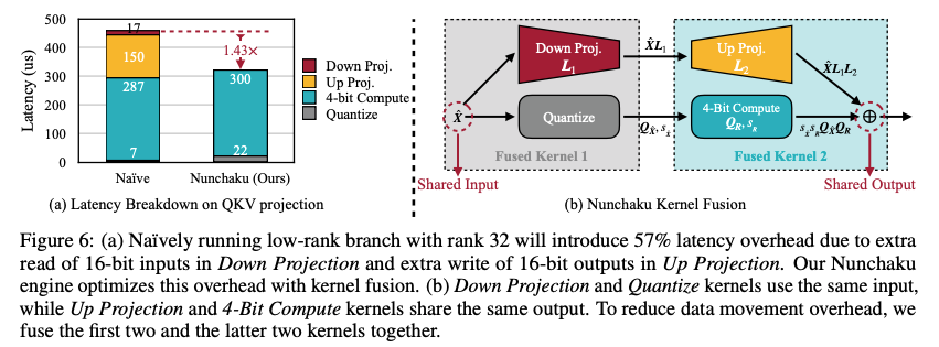 由于 SVDQuant 引入了低秩分支,虽然计算量少,但是输入和输出 shape 并没有改变,也需要花费大量的时间用于 memory 操作上。如果不做融合的操作,两个 branch 就会分别对输入和输出进行 memory 读取/写入,这样 memory 的操作就重复了两次。为了解决这个问题, SVDQuant 提出了 Numchaku (双截棍) Fused Kernel 的方式,只对输入和输出进行一次读取/写入,显著减少运行时间