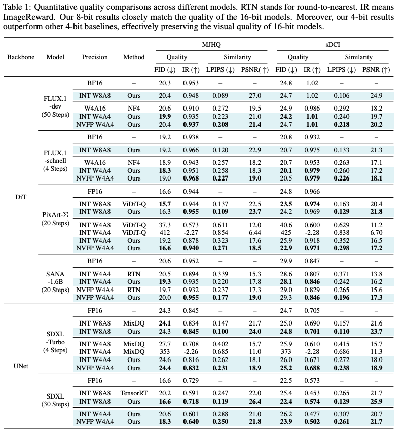 SVDQuant 应该就是受到 LoRA 领域的启发,很有可能其出发点就是想要加速 LoRA 模型。论文的实验都是用的 diffusion 模型,没有 LLM 相关的结果。在 diffusion 评价指标上,SVDQuant 的指标都很好,非常接近 fp16 模型