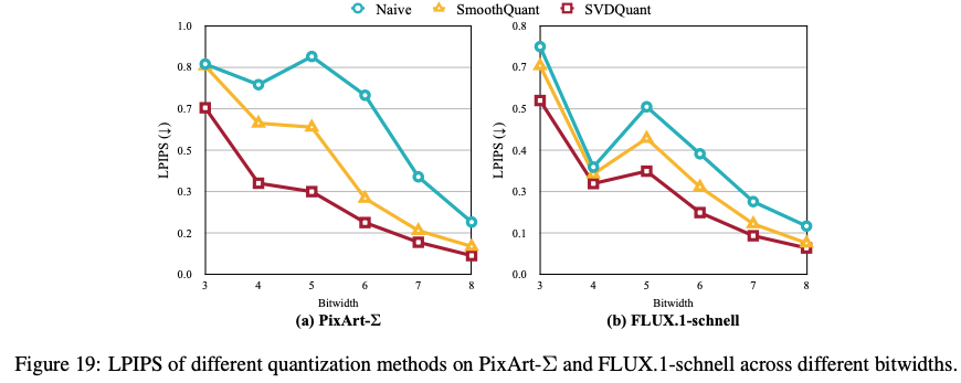 另外论文也指出对于 2-bit 量化(W2A4 or W4A2),SVDQuant 无法生成有意义的图像,一些研究也指出对于如此低 bit 的量化需要使用 QAT 的方式来大量更改 weight 的分布
