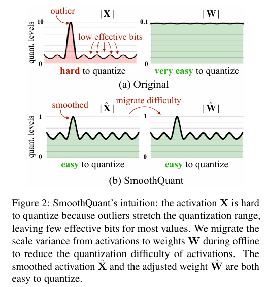 SmoothQuant 将其中的\(X,W\)替换成为了\(\hat{X},\hat{W}\),降低了 activation 的 F-范数大小,也通过减少异常值来减少 activation 的量化误差。需要注意的是: