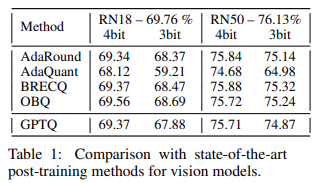 论文测试了 GPTQ 在 ResNet18 & ResNet50 上的量化效果,可以看到在 4-bit 量化中,GPTQ 几乎和最好的方法打平;在 3-bit 量化中略逊色于最好的方法。在量化时间上 GPTQ 只需要 < 1 min 的时间,而 OBQ 方法则需要 1 小时,这是 GPTQ 的优势