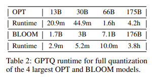GPTQ 算法在量化 1-3B 参数量的模型只需要几十分钟,对于 175B 参数量的模型则需要 3-4 个小时 (on single A100 GPU)